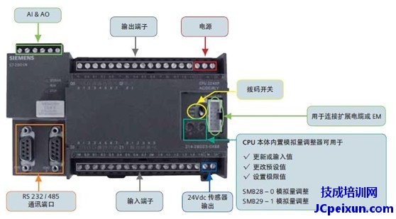我们可以看到CPU包括了RS485通讯口、可选卡插槽、CPU状态LED灯、数字量输入输出端子、I/O点状态LED灯、CPU电源端子、24VDC传感器输出端子、拨码开关、电位计和扩展模块接口等,如果是CPU224XP的话,还会有模拟量输入输出端子。对CPU结构,我们不仅要知道构造的名称和位置,还要了解各部分的功能。像知道通讯口的功能就是用来通讯,扩展模块接口就是用于连接下一个扩展模块,拨码开关就是用来切换运行或停止状态等等。
